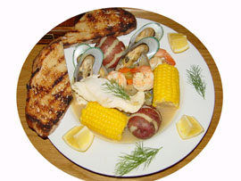 Bring butter, ale and stock to a simmer in a large saute pan with a lid. Add vegetables, cover and cook approximately 10 minutes or until potatoes are just tender. Add whitefish and cook 2 minutes. Turn the filets over, add shellfish, cover and cook about 3 more minutes, depending on size. Serve in a bowl garnished with lemon wedges and dill. Season to taste with salt and fresh ground pepper. Garnish: lemon wedges and fresh dill sprigs